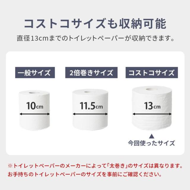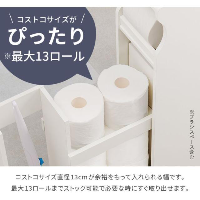 直径13?pの太巻き対応。トイレットペーパーの補充や取り出しがしやすく、スリムなのに掃除用具もスッキリ片付くトイレラック