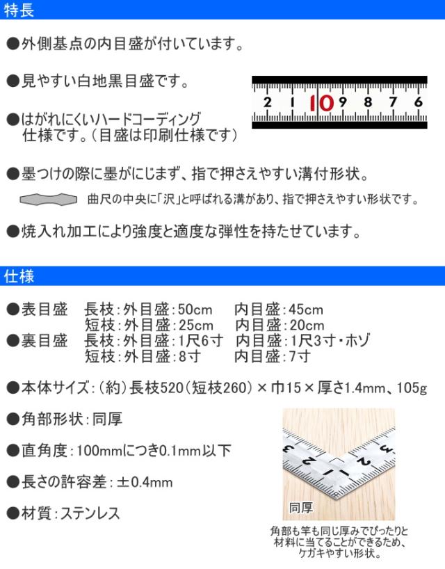 曲尺 同厚 ホワイト 名作 50cm/1尺6寸 併用目盛 11106 ものさし 定規 曲尺 ステンレス製 測定 シンワ測定 ホワイト 剥げにくい 併用目盛