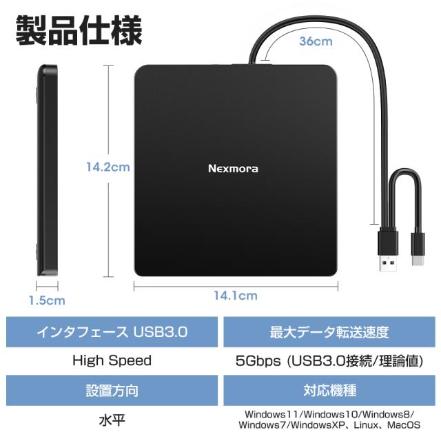 特徴:高速転送,静音,Mac&Windows両対応,幅広いメディア対応,軽量,薄型,ポータブルdvdドライブ