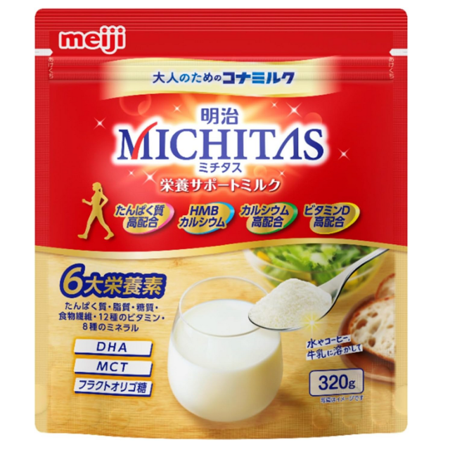 | 明治 MICHITAS(ミチタス) 栄養サポートミルクの特長 ■いつまでもアクティブに動きたいミドル〜シニア層のために、HMBカルシウムを配合し、たんぱく質・カルシウム・ビタミンDを配合にて設計。 ■6大栄養素(たんぱく質・脂質・糖質・食物繊維・12種のビタミン・8種のミネラル)が摂取できる。 ■大人のための健康にうれしいDHA、MCT、フラクトオリゴ糖を配合。 ■水やコーヒー、牛乳など、お好きなものに溶かして飲める。 明治 ミチタス 栄養サポートミルクの原材料名 デキストリン(国内製造)、全粉乳、乳清たんぱく、砂糖、難消化性デキストリン、フラクトオリゴ糖、カルシウム、ビス-3-ヒドロキシ-3-メチルブチレートハイドレート(HMBカルシウム)、中鎖脂肪酸油(MCT)、DHA含有精製魚油パウダー、酵母、リン酸Ca、酸化ケイ素、V.C、塩化K、炭酸Ca、炭酸Ma、増粘剤(ブルラン)、乳化剤、香料、V.E、カゼインNa、ピロリン酸第二鉄、ナイアシン、パントテン酸Ca、V.B6、V.A、V.B2、V.K、葉酸、V.D、V.B12、(一部に乳成分・大豆を含む) 明治 ミチタス 栄養サポートミルクの栄養成分表示 1食(20g)あたり エネルギー(75kcal)、たんぱく質(3.8g)、脂質(1.6g)、炭水化物(12.8g)、糖質(11.0g)、食物繊維(1.8g)、食塩相当量(0.07g)、亜鉛(1.0mg)、カリウム(90mg)、カルシウム(240mg)、セレン(7μg)、鉄(0.75mg)、銅(0.05mg)、マグネシウム(20mg)、リン(70mg)、ナイアシン(2.8mg)、パントテン酸(0.6mg)、ビタミンA(67〜209μg)、ビタミンB1(0.15mg)、ビタミンB2(0.20mg)、ビタミンB6(0.30mg)、ビタミンB12(0.60mg)、ビタミンC(50mg)、ビタミンD(2.9μg)、ビタミンE(3.0mg)、ビタミンK(16.0μg)、葉酸(16〜62μg)、カルシウム ビス-3-ヒドロキシ-3-メチルブチレートモノハイドレート(HMBカルシウム)(500mg)、DHA(5.4mg)、MCT(300mg)、フラクトオリゴ糖(1000mg) 【アレルギー物質】乳成分、大豆 明治 ミチタス 栄養サポートミルクのお召し上がり ●1食当たり20g(大さじ約3杯)を目安に、約100mlの水やお湯に加え、よくかき混ぜてお召し上がり下さい。 ●コーヒーや牛乳、紅茶などに混ぜてもおいしく召し上がれます。 ●溶かしたミルクは速やかにお飲みください。 ●溶かす飲み物の量は、お好みに応じて調整して下さい。 ●熱湯等の高温ではたんぱく質が変性して溶けにくくなります。70度以下に冷ましてから本品を加えてください。 取り扱い上の注意 ・本品は乳幼児用ではありません。 ・開け口や袋のはしで手を切るなどのケガをしないようにご注意ください。 ・開封後はホコリや髪の毛が入らないようジッパーをしっかりと閉め、直射日光や等温多湿を避け、でくるだけ早めに使用してください。 ・濡れたスプーンを袋の中に入れないでください。粉が固まることがあります。 ・製品中に色の濃い粒が見えることがあります。これは現材料の一部で品質に問題ありません。