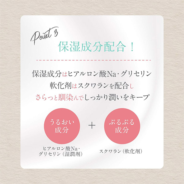 ベンゼトニウム塩化物 0.05w/v%、[添加物]精製水、カルボキシビニルポリマー、濃グリセリン、水酸化カリウム、ミリスチン酸イソプロピル、流動パラフィン、スクワラン、ワセリン、トコフェロール酢酸エステル、親油型モノステアリン酸グリセリル、ポリオキシエチレンセチルエーテル、エタノール、ヒアルロン酸ナトリウム(2)