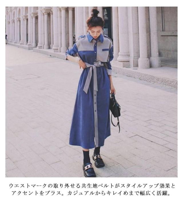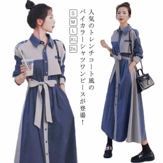 シャツワンピース 配色 レディース ロングワンピース デニム風 パッチワーク 長袖 マキシワンピース 春 ロングコート スプリングコート