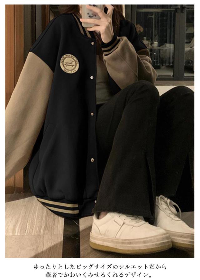 ジャケット スウェット スタジャン ゆったり ブルゾン ライトアウター 韓国ファッション ロゴ バイカラー レディース スタジアムジャンパ