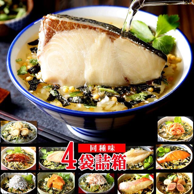 特上の締めのご馳走!本格だし茶漬け飯膳[4袋詰箱] (鰤 炙り河豚 辛子明太子 しらす 桜えび 蟹 鱈子 帆立)