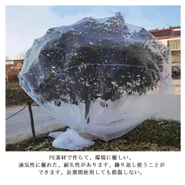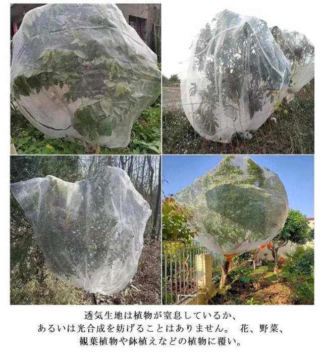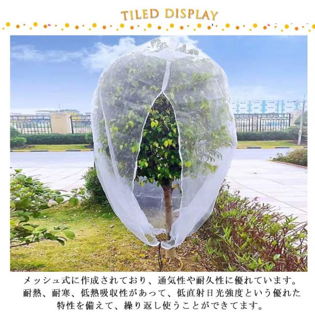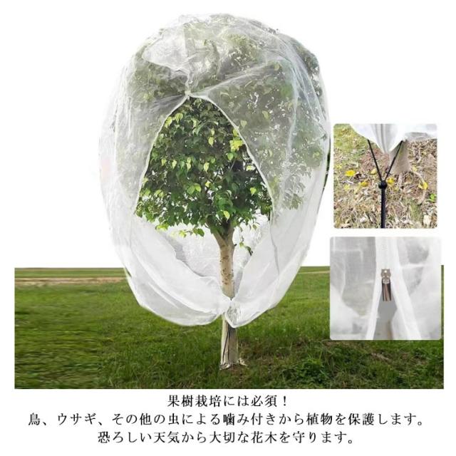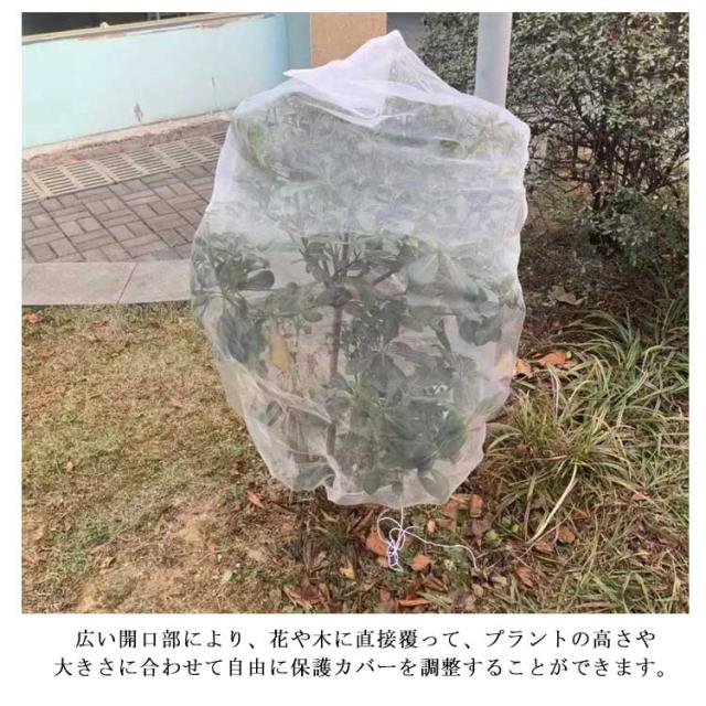 | メッシュ式に作成されており、通気性や耐久性に優れています。耐熱、耐寒、低熱吸収性があって、低直射日光強度という優れた特性を備えて、繰り返し使うことができてます。 PE素材で作らて、環境に優しい、通気性に優れた、耐久性があります、繰り返し使うことができます。長期間使用しても損傷しない。 果樹栽培には必須!鳥、ウサギ、その他の虫による噛み付きから植物を保護します。恐ろしい天気から大切な花木を守ります。 透気生地は植物が窒息しているか、あるいは光合成を妨げることはありません。 花、野菜、観葉植物や鉢植えなどの植物に覆い。 ファスナー付きタイプなので、樹木に被せてファスナーを締めるだけの簡単取付け。 広い開口部により、花や木に直接覆って、プラントの高さや大きさに合わせて自由に保護カバーを調整することができます。 | |