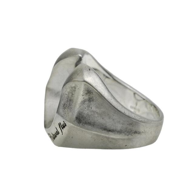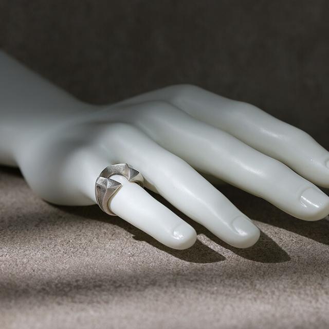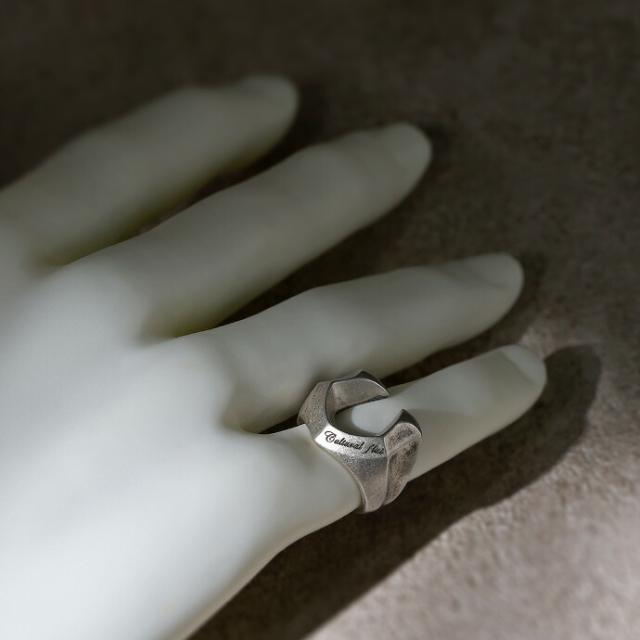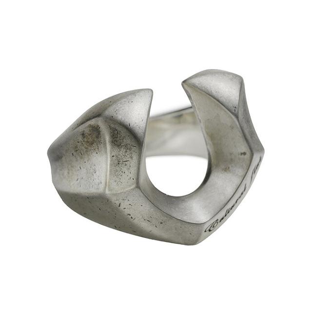 ボリュームとシャープさを併せ持つ、立体的なデザインのホースシュー(馬蹄)リングです。FLUI独自のヴィンテージ加工により理想のヴィンテージ感を再現しています。くり抜きではなくフラットなのでしっかりとした重量感が楽しめます。主張しすぎない控えめな輝きが魅力の、ジーンズスタイルやアメカジ系などのカジュアルな服装に合わせやすいリングです。