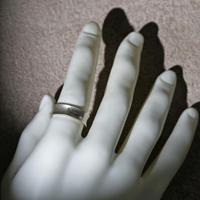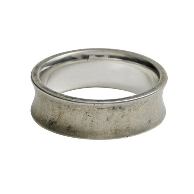 中央がくびれた、シンプルな逆甲丸デザインのリング。FLUI独自のヴィンテージ加工により理想のヴィンテージ感を再現しています。中心にはブランド名が刻印されています。主張しすぎない輝きが魅力の、ジーンズスタイルやアメカジ系などのカジュアルな服装に合わせやすいリングです。