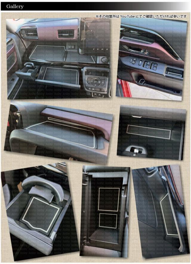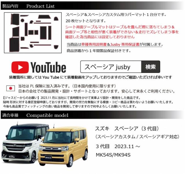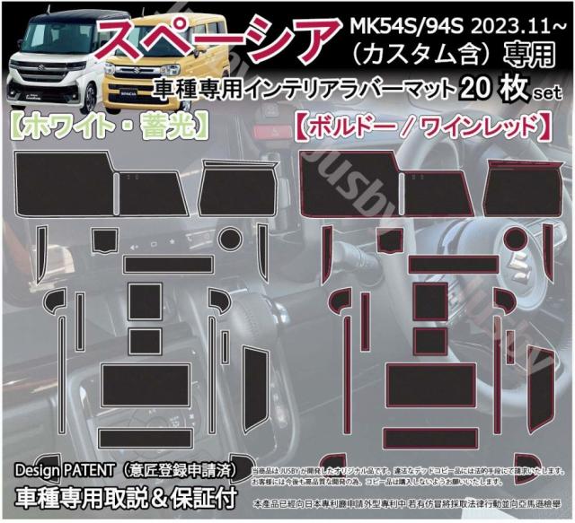 | 2023.11発売のスズキ スペーシア&スペーシアカスタム 専用ラバーマットです。 スズキ スペーシア&スペーシアカスタム用 (MA54S / MK94S型 )モデル専用のインテリアラバーマットです。 スマートフォン等を置くと発生する運転中のカタカタ音・横滑りの防止やパネルへの傷防止、ドレスアップに最適です。 運転席メーター上は傾斜が有る為、奥側部分まで保護出来るように設計しました。 新型になり車内が先代以上に静かになった事もあり小物が動いた際などパネルと干渉・異音等が発生しやすい為是非当マットで保護&ドレスアップをお勧めいたします。 全20枚セットでポケット類全てに装着可能です。全ての装着箇所についてはしております。 ご検討の参考にしていただければ幸いです。 ・スペーシアの内装色にマッチする「ホワイト・蓄光」及び「ボルドー/ワインレッド」の2色を設定しました。好みに応じてお選びください。 ・「ホワイト」タイプのみ蓄光タイプとなっておりますので、蓄光した箇所は暗くなると光ります。トンルに入った際など格好良く光のラインが浮かび上がります。(通常時に光の当たる場所のみ暗い場所で光ります。夕方から発光する為、夜等は基本光りません。明るい場所から暗い場所に入った際のみ光りますのでご注意ください) 完全オリジナル設計で時間をかけCADにて製図して製作しておりますのでフィッティングには自信があります。 取付説明書とJusby専用の製品保証書が必ず付属いたします。1年間は不具合・不適合・初期不良に対しての製品保証を行いますのでご安心してお買い求めください。 ( ・∀・)Φスタッフレビュー 専用設計なのでフィッティングがとにかく良く、純正の様に見えます。 携帯電話等車で充電しながらそのまま置いていた部分にもラバーマットで保護できる為、携帯電話及び車両パネルにも優し満足度が高い逸品です。 2023年11月発売商品です。当社オリジナル商品となっておりコピー対策として形状等の意匠登録申請済みです。 当社商品のデッドコピー・模倣に関しては、販売「業者」及び、コピー目的での購入者「個人」に対して請求させていただきます。 お客様にも車両購入・開発費等を無駄にするデッドコピーは購入されないようお願いいたします。 |