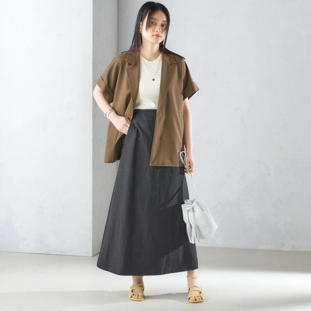 ハイウエストデザインのためトップスインや、コンパクト丈のトップスですっきりとスタイルアップがおすすめ。