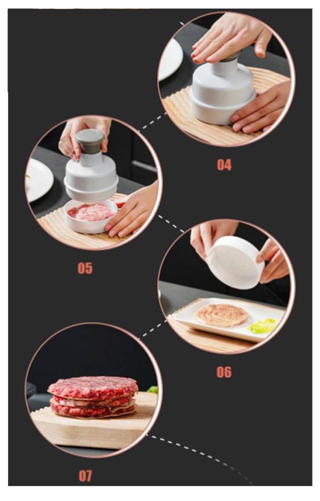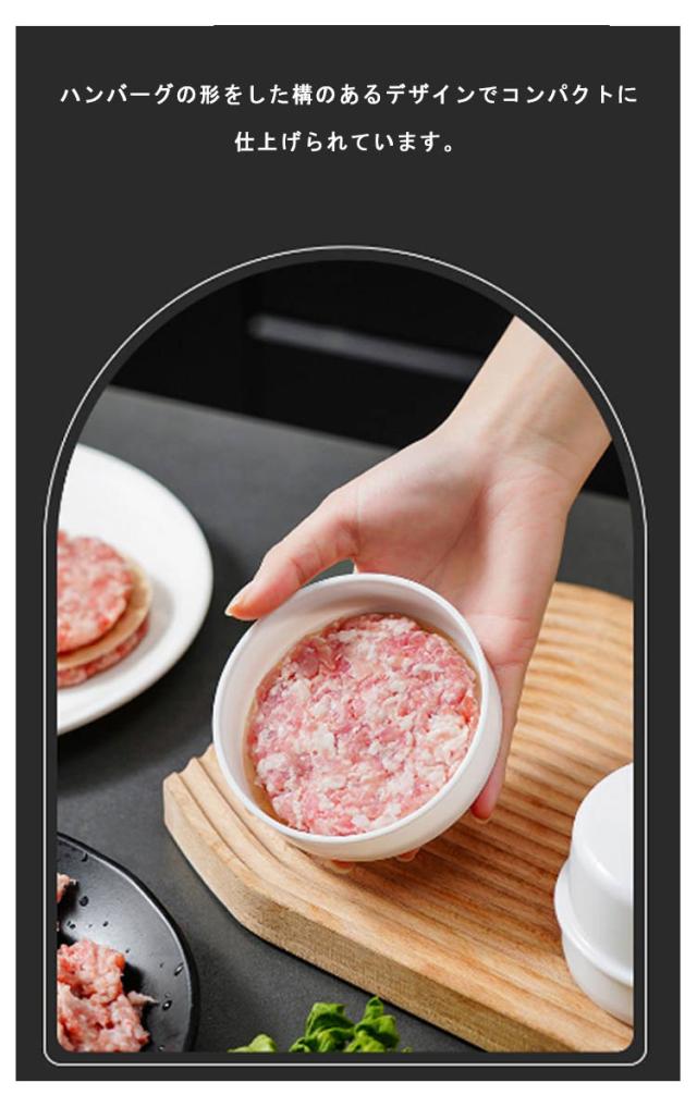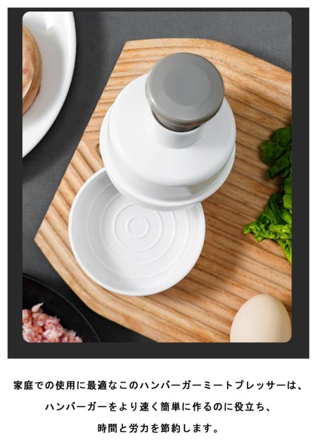 | 底がリング状になっているので、底がつきにくく、型抜きがしやすいです。 ハンバーグの形をした構のあるデザインでコンパクトに仕上げられています。 押し圧デザインで、自動で返ってくるので操作が簡単になります。 家庭での使用に最適なこのハンバーガーミートプレッサーは、ハンバーガーをより速く簡単に作るのに役立ち、時間と労力を節約します。 キッチン、屋内、キャンプ、料理、パーティー、庭などに適しています。 ランチ、ディナー、ハンバーガーバーベキューなどに。 | |