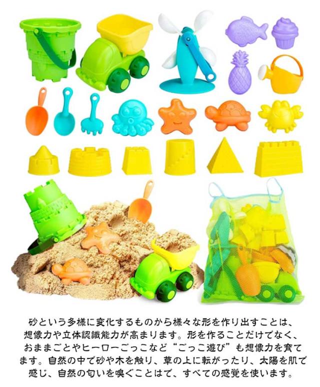 | 【お砂場セット】【砂遊び】【24PCS】 柔らかいプラスチックなのに、割れにくくなっています。取っ手も柔らかいので、子どもの手を傷つけにくいのが特長です耐久性、安全性に優れています。持ちやすいサイズと角も丸いデザインは赤ちゃんが安心して遊ばせることができます。 お家で砂遊び今すぐ遊びたい!お砂場でも、プールでも、お風呂に入る時だってお楽しみます。お子様より大喜び間違いなし!小さなお子様でも使いやすいお砂場セットです。 砂場、ビーチなどの海辺と室外だけでなく、お風呂、お庭、雨の日に室内で遊んでも遊べます。この砂遊びセット一つで、お砂場遊び・水遊び・お風呂遊び・雪遊びなどが充分楽しめます。 季節を問わず、いつでも遊ばれます。無限の遊び方ができるので、お子様の想像力と創造力を広げます。 砂遊びは、おもちゃで型取りをしたり、バケツプリンや泥団子を作ったり、穴を掘ったり、大きな動きから小さな動きまで、指先をたくさん使います。これは、言語の発達促進にもなります。 砂という多様に変化するものから様々な形を作り出すことは、想像力や立体認識能力が高まります。形を作ることだけでなく、おままごとやヒーローごっこなど“ごっこ遊び”も想像力を育てます。自然の中で砂や木を触り、草の上に転がったり、太陽を肌で感じ、自然の匂いを嗅ぐことはで、すべての感覚を使います。 夏休みに遊び玩具として お子様やお孫様へのプレゼントに最適。お誕生日、入園卒園進学のお祝い、出産祝いの贈り物などのプレゼントにお勧めです。 | |
