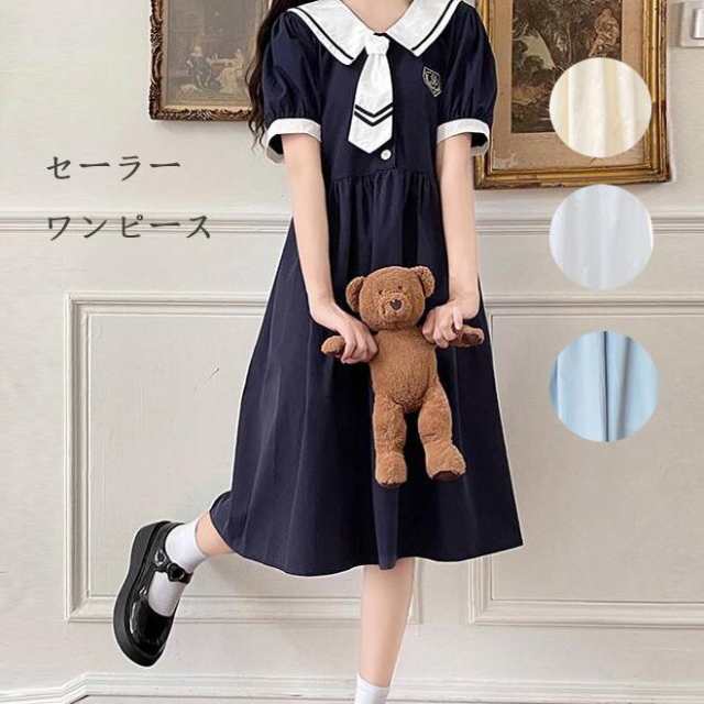 セーラーワンピース マリンセーラー風ワンピース ミモレ丈ロング丈レディース セーラー 団体服 通学フレア学院風シャツワンピ ロリータ 森ガール 海軍風