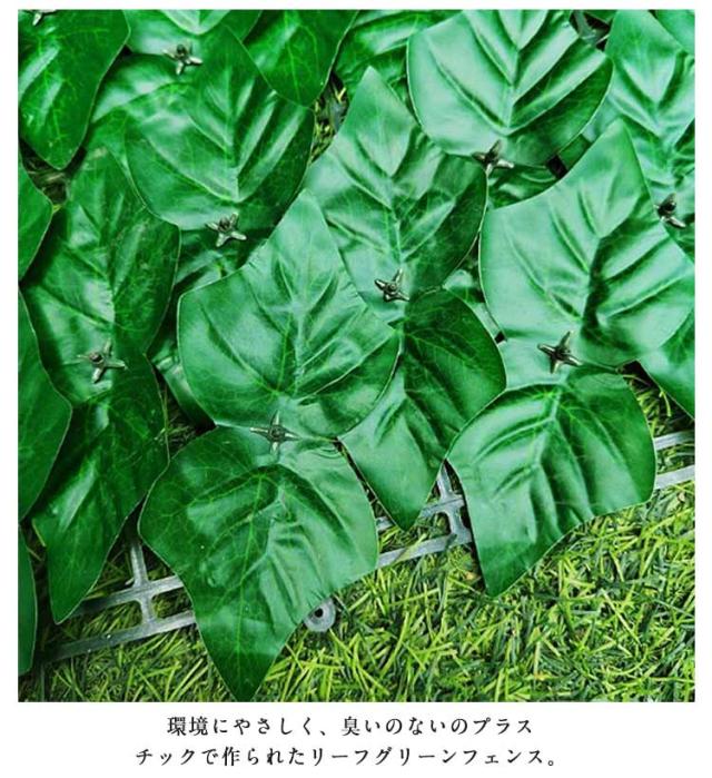 | 爽やかでおしやれに目隠! 本物の植物と異なり、虫の心配もありません。 グリーンフェンスは枯れる心配も要らず、お手入れもほぼ不要です。 イミテーションなので面倒な水やり、お手入れも不要。 本物の植物と異なり、虫も寄ってこないので安心です。 通気性抜群で爽やかな風が通り抜けます。 環境にやさしく、臭いのないのプラスチックで作られたリーフグリーンフェンス。 高温と低温に耐え。 また、土を必要としないので、お庭だけではなくベランダにも施工できます。 | |