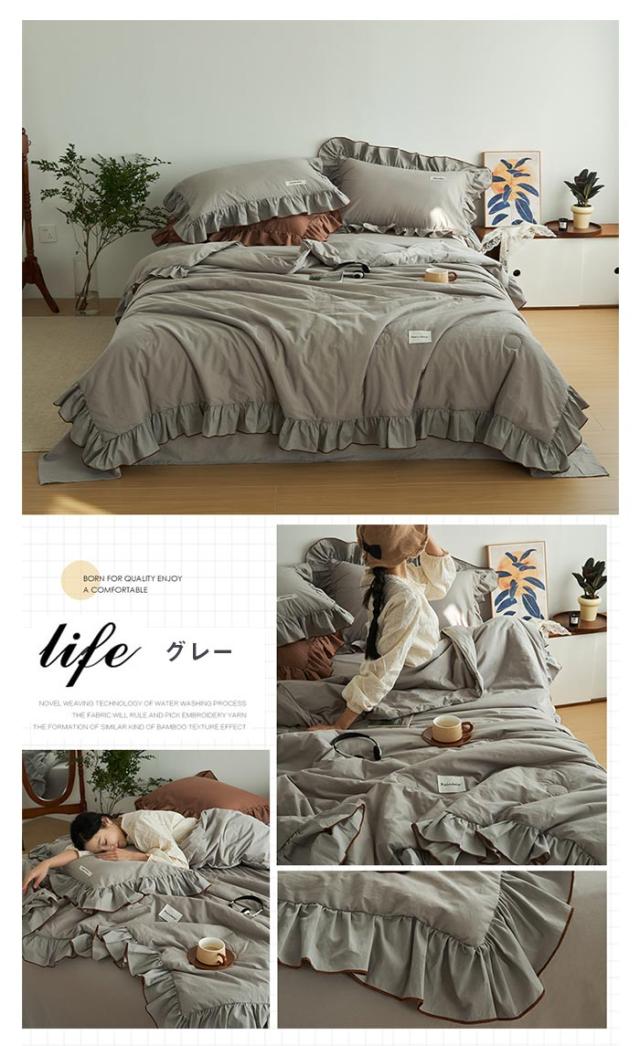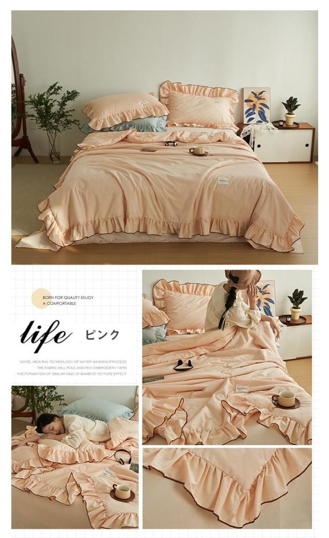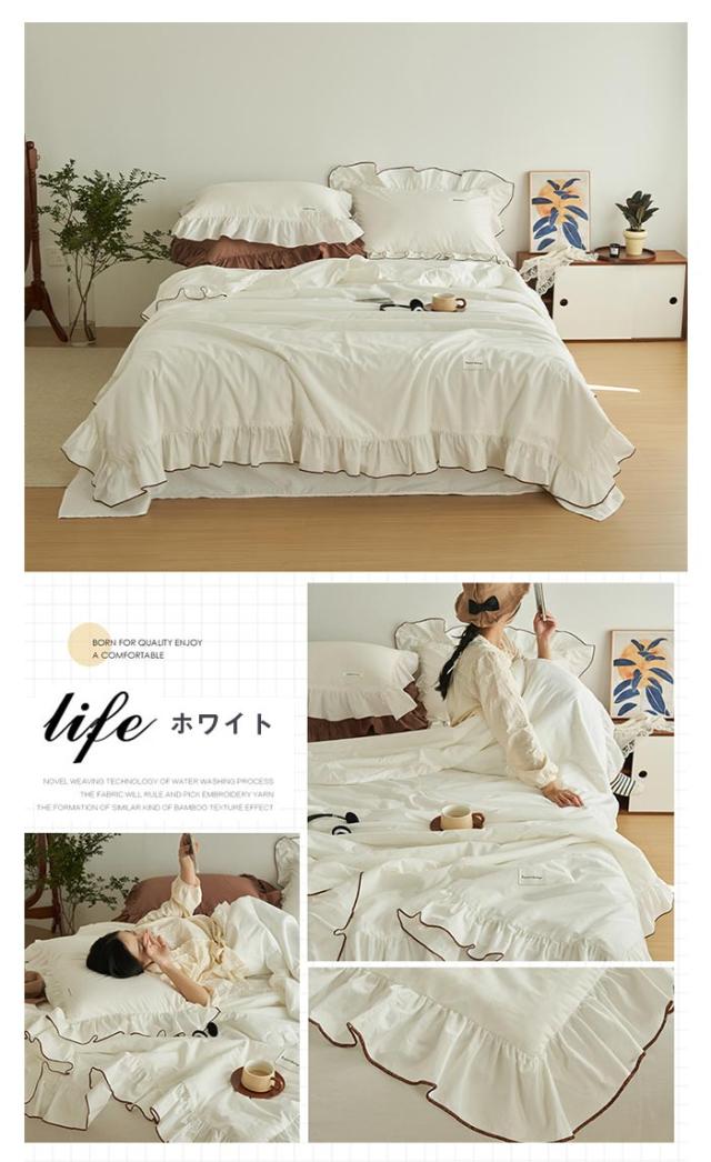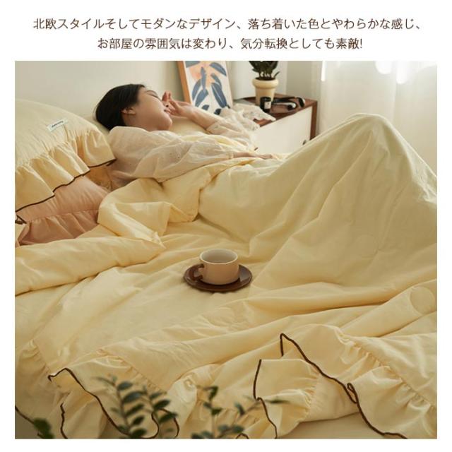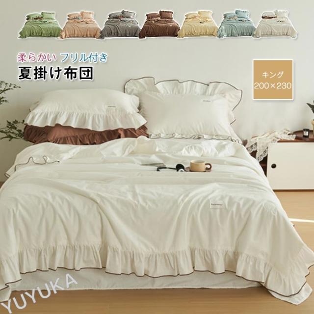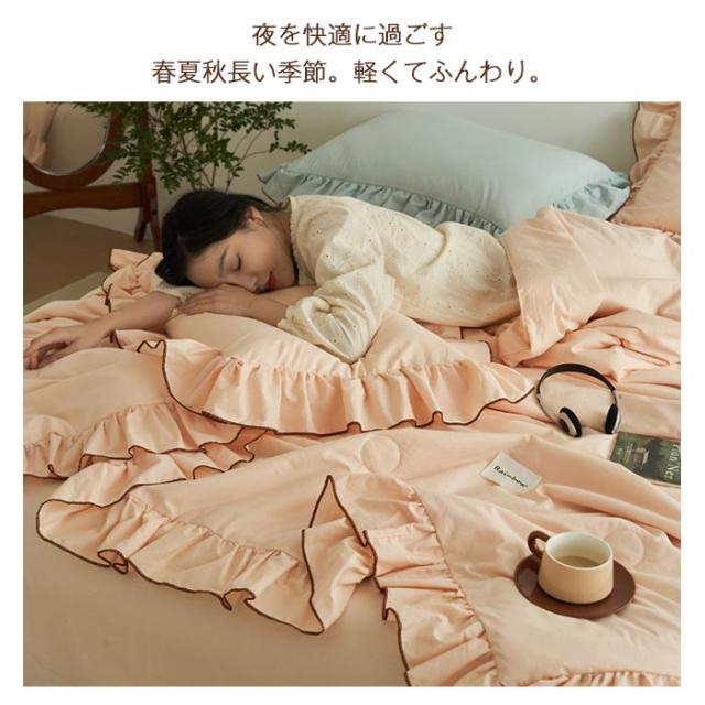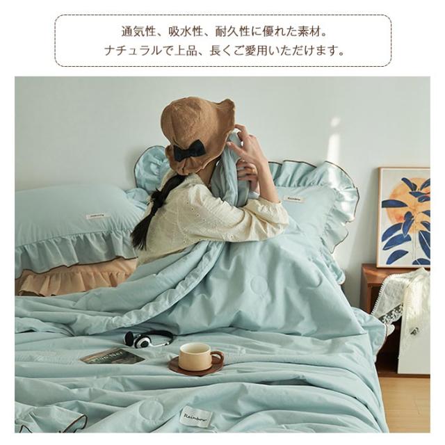 北欧スタイルそしてモダンなデザイン、肌掛け布団の周囲はロマンティックフリルをあしらいました、落ち着いた色とやわらかな感じ、お部屋の雰囲気は変わり、気分転換としても素敵! 【通気性、吸水性、耐久性に優れた素材】 さらりとした肌触り、通気性と吸水性が良く、ソフトで快適な生地。 素材感や自然な感じを演出くれます。ふんわりとした自然な風合いを保ちます。 【季節を問わず】色が落ち着いているので睡眠時に癒されます!やわらかな肌触り、春夏も快適に眠れる夏布団です。 冬に掛け布団と併用できます。季節を問わず通年お使いいただけます。