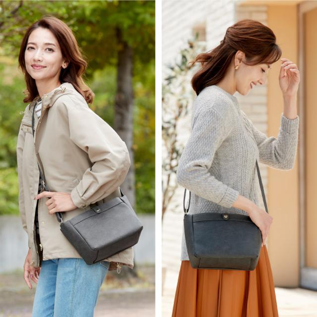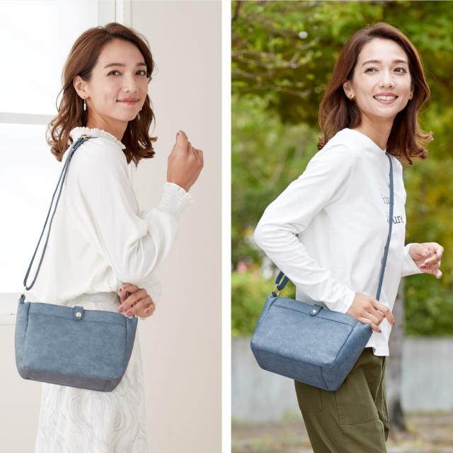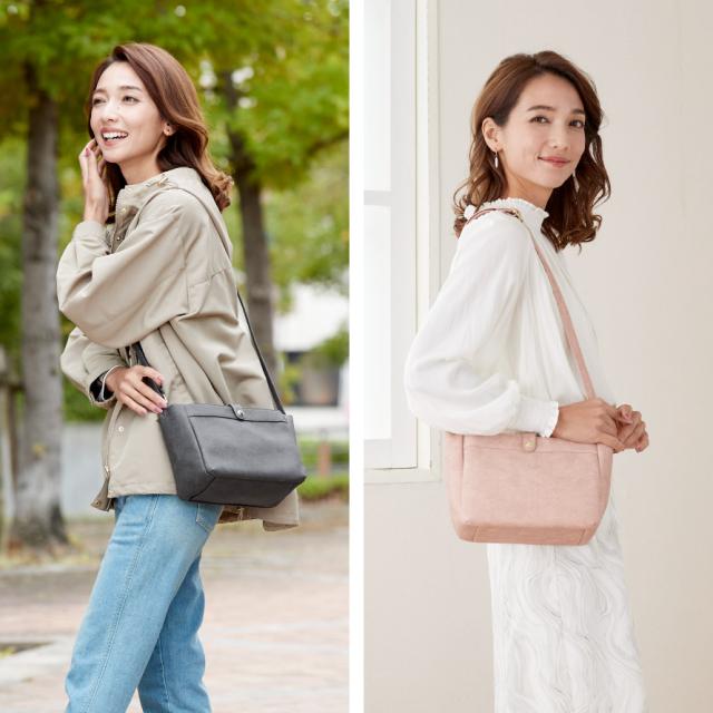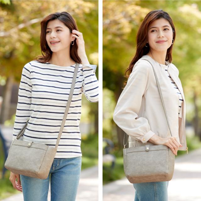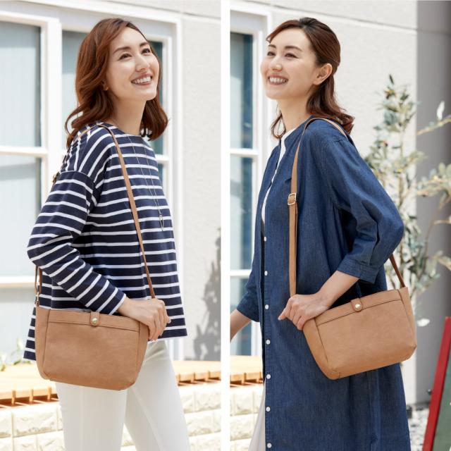 シンプルなデザインでいろんなコーデに合わせやすい。シーンによって肩掛けや斜め掛けにできます。ショルダーは調節可能です。