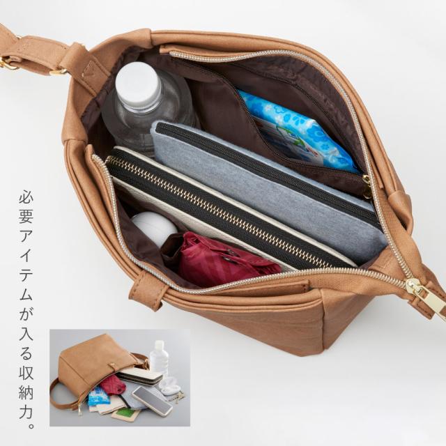大きすぎず小さすぎないサイズ感が使いやすいショルダーバッグ。最低必要アイテムが納まる収納力で、毎日のお出かけに使えて◎。