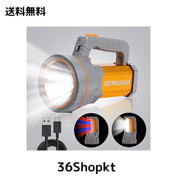 GEPROSMA 2018 NEWデザイン多機能大きいハイパワ + 充電式LEDスポットライト懐中電灯ト + チハンドヘルド: 超明るいロングビームスポットライト + 別個の明るいサイドフラッドライトランタン + 充電式大型電池バッテリー10000mah + USB出力電源バンク + ハンドヘルド + 持ち運び用ショルダーストラップ + 背面のネジ穴は三脚や自転車ホルダーに取り付けることができます (パッケージに含まれていない三脚または自転車ホルダー) 高出力の超高輝度スーパー明るいLEDスポットライト: 超明るいクリーLED、800メートルの超長距離照明(高輝度時) ユニークな明るい側面のランタン: サイドランタンは、明るい白のledとRED / Blueストロボライトの両方を持ち、作業灯、船,ボート,キャンプテント、建設、自動車、修理、救助、停電 に使用することができます,SOS点滅,防災害対策 あなたの携帯電話を充電するための大きな充電式バッテリーパックとUSB出力(パワー・バンク): 内蔵充電式マルチ18650リチウム電池10000mah(18650 * 4個),超長照明時間:10-32h時間 緊急時にあなたの携帯電話を充電するためのUSB出力電源バンク 強力なアルミニウム合金ハウジング/ IPX4防水耐水 商品仕様: ライトカラー:フロントスポットライト:ホワイトLED サイドライト:白色LED +赤色/青色LED 光源:超明るいクリーLED、高輝度時の超長距離800メートル 6調光モード:フロントライト:ハイ/ロー/フラッシングモード。 サイドフラッドライト:高/低/赤青色の光SOS点滅モード 硬い光の範囲:800m 低照度範囲:400m バッテリー:4x 内蔵充電式リチウム18650電池 (10000MAH) 照明時間:10-32h時間 充電時間:8-10h時間 充電器: 入力:AC100V-240V / 50HZ / 60HZ 出力:DC4.2VまたはDC5.0V,1A USB出力:はい、携帯電話などを充電することができます。出力DC5V 0.8-1.0A パッケージに含まれるもの:1 x強力な懐中電灯、1 x充電器、1 xショルダーストラップ、1 xマニュアル。