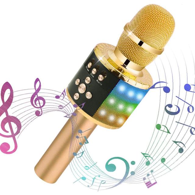 ?【多彩なライトで飾れる】:マイクはカラフルなLEDライトで飾られて、音楽のリズムに合わせてLED色が変化できます。音量が高ければ高ほどマイクのライトがより速く点滅して、素敵で美しい雰囲気を醸し出しことができます。聴覚だけでなく、視覚的にもお楽しみいただます。どこにでも、パーティーを始めることができます!(ご注意:ライトを消した状態で使用できます、ただ「M」ボタンを長押します。)