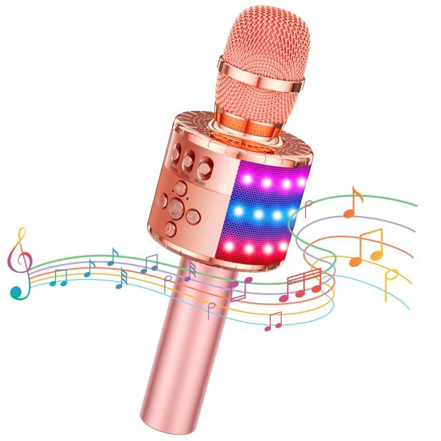 ?【多彩なライトで飾れる】:マイクはカラフルなLEDライトで飾られて、音楽のリズムに合わせてLED色が変化できます。音量が高ければ高ほどマイクのライトがより速く点滅して、素敵で美しい雰囲気を醸し出しことができます。聴覚だけでなく、視覚的にもお楽しみいただます。どこにでも、パーティーを始めることができます!(ご注意:ライトを消した状態で使用できます、ただ「M」ボタンを長押します。)