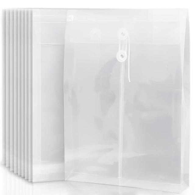 収納性の高い封筒型ファイルケース パッケージ内容:クリアファイル封筒型x10枚 サイズ:約縦32x横24cmxマチ約3cm 材質:ポリプロピレン(PP)。色:透明(クリア)厚口:0.18mm マチ付きので大量の用紙をはじめ、小物などもまとめて保管できる、重要書類を持ち運ぶときは、しっかりと紐で閉じられるハトメ&紐付きタイプのファイルバッグです。