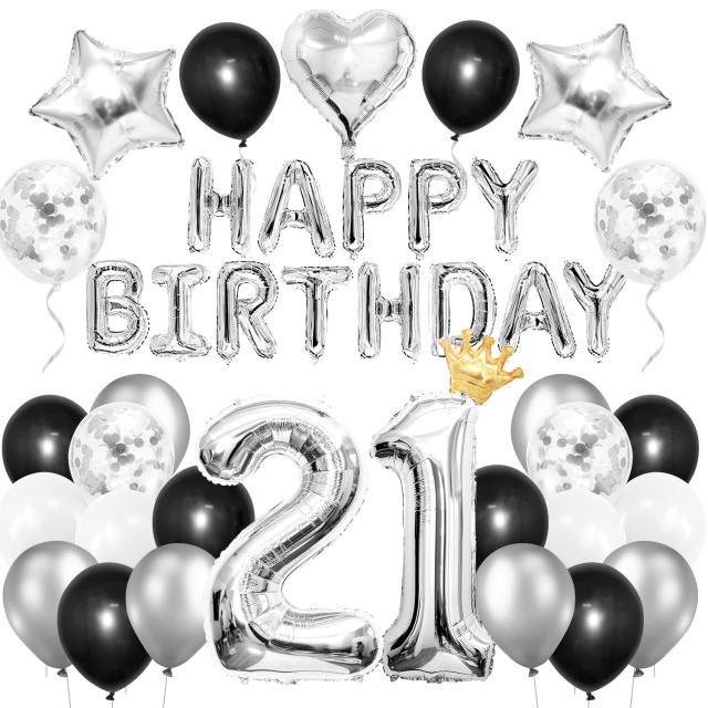 【豊富な誕生日飾り付けセット】?HAPPY BIRTHDAYアルミガーランド×1 ?ブラック風船×6 ?シルバー風船×6 ?ホワイト風船×4 ?紙吹雪風船×4 ?星形アルミバルーン×2 ?ハートアルミバルーン×1 ?ゴールド王冠x1 ?数字“21” ?リボン×10m ?ドットシール×40点 ?吸込管×1本