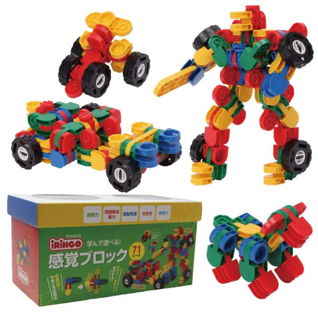 71ピースはロボットからレーシングカーに変身するなど、その他にも10種類以上の作品が作れます。上下左右どの方向でも組み合わせができ、180度回転するので、はめる組み合わせる角度を変えるの作業が子供たちの創造力を育てます。角度を変える時にはカチッカチッと心地良い音がリズム良く響きます。組立ながら想像力を発し、作品を完成していく間に、論理的な思考力が養われます。目標設立分類予測図形分別など、基本的な3次元概念を理解します。友達