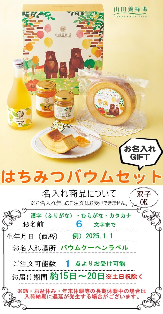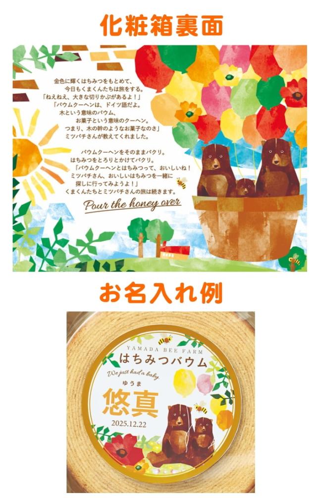 山田養蜂場 名入れ はちみつバウムセット 67877 ギフト、出産内祝い、お子様、お名前、オリジナル、お返し、贈り物、美味しい、ブランド、手土産、出産、赤ちゃん、子供、1点から受注、はちみつ、お菓子