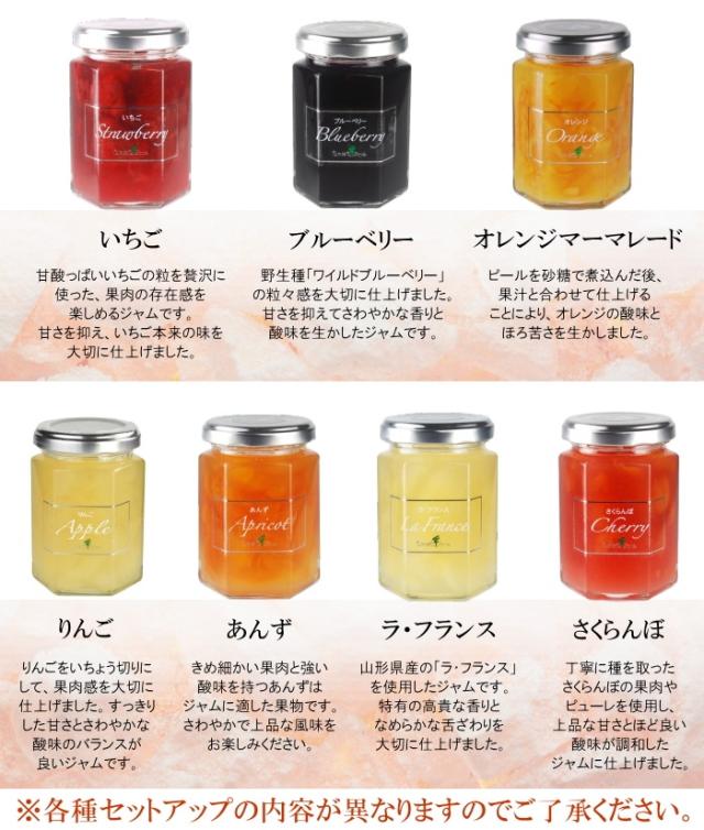〇セット内容:フルーツソース(ブルーベリー)(220g)・フルーツソース(フルーツミックス)(215g)・ミックスジャム(フルーツキューブ)(155g)・ジャム(いちご・ラフランス・あんず)(各145g)・ドレッシング(オニオンハーブ・ノンオイル大根と人参・焙煎ごま)(各122ml)×各1