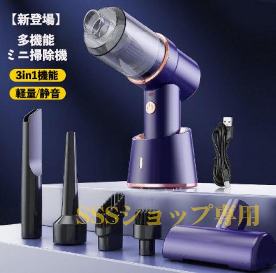 ハンディクリーナー コンパクト 車用掃除機 乾湿両用 USB-C充電 充電スタンド付き 8000PA LEDライト 3in1機能 エアーポンプ機能付き 軽量