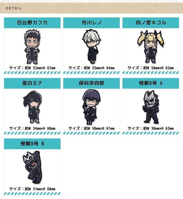 【日比野カフカ】約W 33mm×H 66mm 【市川レノ】約W 35mm×H 64mm 【四ノ宮キコル】約W 50mm×H 63mm 【亜白ミナ】約W 35mm×H 61mm 【保科宗四郎】約W 30mmH 61mm 【怪獣8号 A】約W 30mm×H 63mm 【怪獣8号 B】約W 31mm×H 60mm |