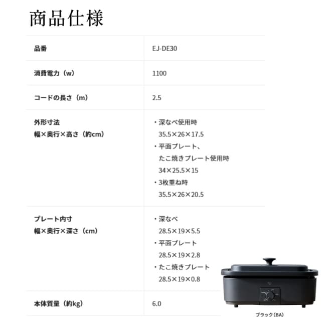 象印 デイリーコンパクトプレート EJ-DE30-BA ブラック 深なべ 平面プレート たこ焼きプレート付き 無水調理 ホットプレート ZOJIRUSHI