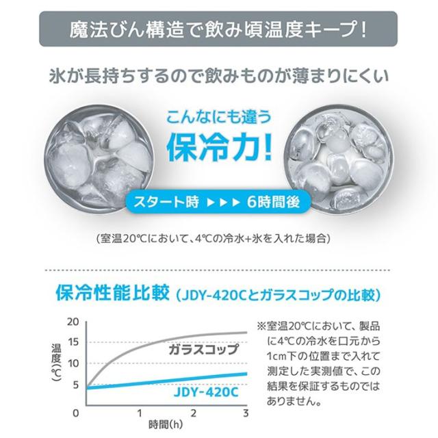 ※保冷効力とは、室温20℃±2℃において製品に4℃以下の水を口元から1cm下の位置まで満たし、