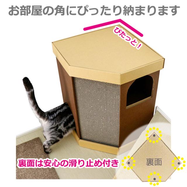 部屋の角にもぴったり納まり、底面には滑り止めが付いているのでずれにくく安心です。<爪とぎがセットになった、2階建て猫ハウス(組立式)♪