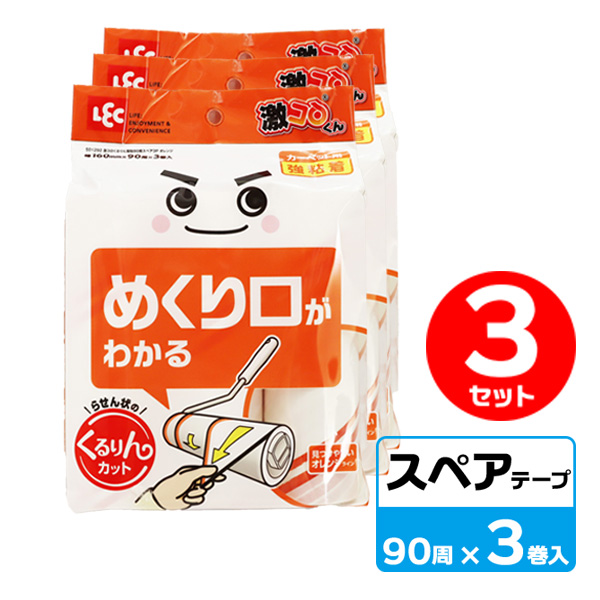 粘着スペアテープ 激コロくん くるりん強粘スペア 90周 オレンジ 3巻 ×3セット S01292 | コロコロ めくりやすい 斜めカット らせん状 各社共通サイズ セット販売 替え 掃除用品 カーペット用