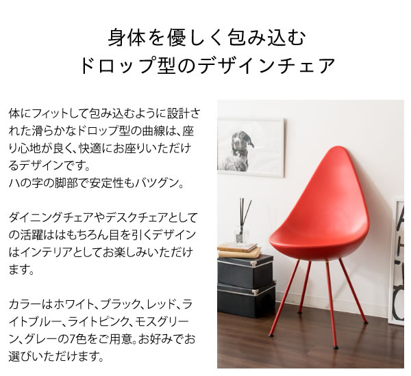 ダイニングチェア 座面高さ47cm いす チェアー カフェ風 椅子 おしゃれ 丈夫 ドロップ型 雫型 椅子 カフェチェア リビングチェア デスクチェア 在宅勤務 リモートワーク デザインチェア 背もたれ 椅子 曲線 一人暮らし 幅45cm 奥行56cm 高さ87cm カラフル おうちカフェ インテリア 家具 チェア 椅子 しずく リビングチェアー ダイニング用椅子 食卓用 カフェ チェア パソコンチェア テレワーク チェア 作業用 椅子 在宅 テレワーク 新生活 ワンルーム リビング ダイニング かわいい かっこいい スタイリッシュ 丸みを帯びたデザイン 固定脚 スチール脚 身体にフィット 快適 くつろぎ 座り心地がいい ホワイト ブラック レッド ライトブルー ライトピンク モスグリーン グレー 白 黒 赤 青 緑 安定
