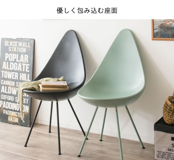 体にフィットして包み込むように設計された滑らかなドロップ型の曲線は、座り心地が良く、快適にお座りいただけるデザインです。ハの字の脚部で安定性もバツグン。