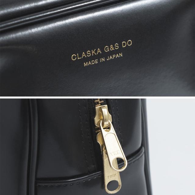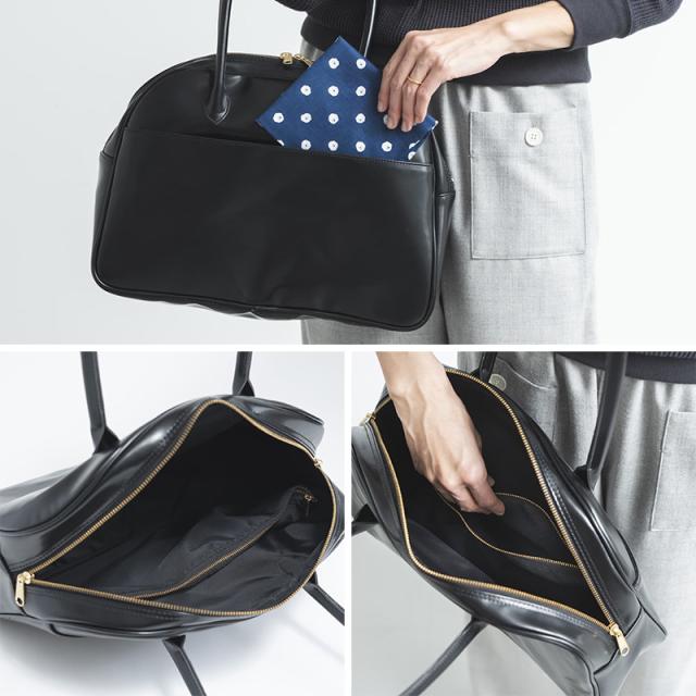つるんとした素材感ですが、光沢は控えめでシックな印象。本体上部には、ブランドネームと“MADE IN JAPAN”の文字をゴールドで箔押ししました。金具やファスナーもゴールドにすることで、クラシカルな雰囲気に。縫製もしっかりしており、上質さが感じられます。