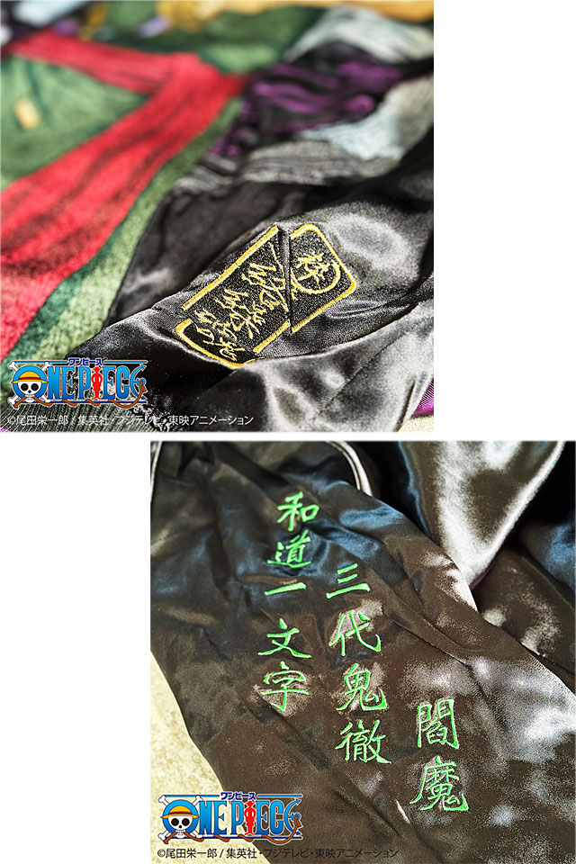 リバーシブル裏は、「【サンジ】黒足のスカジャン」と対になるようなデザインになっており、胸には太刀筋、袖には現在所有している名刀の名前を、ゾロが携えている右側に刺繍。