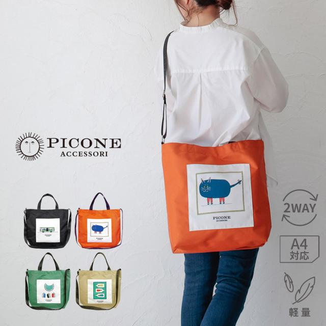 人気ブランドPICONE ACCESSORIのイラストがおしゃれな2WAYトートバッグです。コーディネートのアクセントにピッタリなブランドらしいユーモアのあるカラフルなイラストです。A4対応、マチが広く、大容量のバッグなので通勤や通学の普段使いはもちろん、マザーズバッグ、旅行バッグとしてもご利用頂けます。たっぷり荷物を収納できるサイズ感ですが、わずか230gと軽量です。また、ショルダーベルトと手持ちハンドルをお好みでお使い頂けます。荷物が多い時も肩掛けで持てるので便利です。バッグの開閉はマグネット仕様で、簡単に出し入れできるのも嬉しいポイント♪内側にはオープンポケット1。ギフトやプレゼントにも最適です。