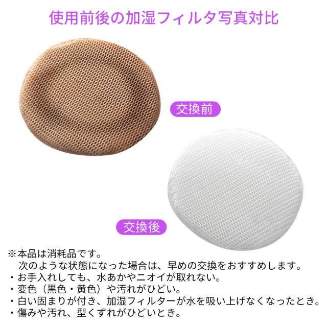 | ※本品は消耗品です。加湿フィルター次のような状態になった場合は、早めの交換をおすすめします。 ・お手入れしても、水あかやニオイが取れない。 ・変色(黒色・黄色)や汚れがひどい。 ・白い固まりが付き、加湿フィルターが水を吸い上げなくなったとき。 ・傷みや汚れ、型くずれがひどいとき。 |