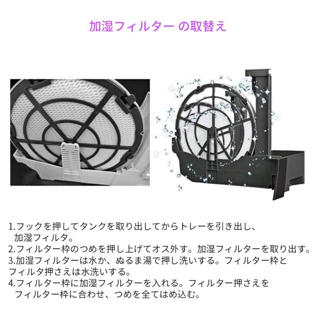フィルターにミネラル分が付着すると、雑菌やカビが繁殖し悪臭が発生したり、加湿量の低下や送風音が大きくなる原因になります。加湿機用洗剤で定期的なお手入れをお願いします。 |