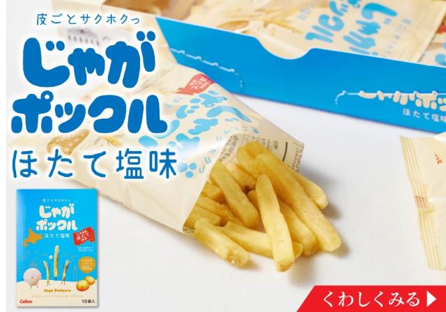 | 商品説明 | 北海道産じゃがいもを、皮ごとお菓子にしました。 独自の製法でじゃがいものおいしさを引き出し、 サクホクっとした食感が楽しめます。 口に入れた瞬間、北海道産ほたて※の旨味が広がる「じゃがポックル」です。 ※本品に北海道産ほたてをほたてパウダーとして 0.02%使用しています。 |