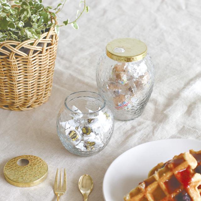 真鍮製のフタとガラス部分はどちらもハンマートーン仕上げになっており、水面のような凹凸のある表情が特徴です。光沢があり高級感のある真鍮素材は、経年変化によりヴィンテージ感のある落ち着いた色味に変化していきます。