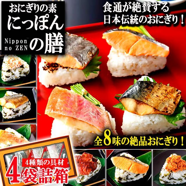 特上の具材!極上の味!おにぎりの素にっぽんの膳[4袋詰箱] (蟹 厚切り牛タン 辛子明太子 金華鯖 鮭 鰆西京焼)