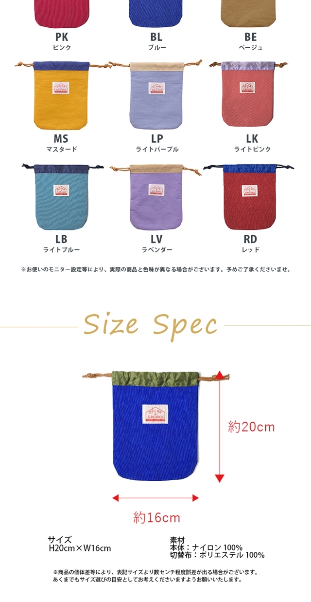 さらにナイロン製で丈夫! バイカラーがかわいい巾着です。