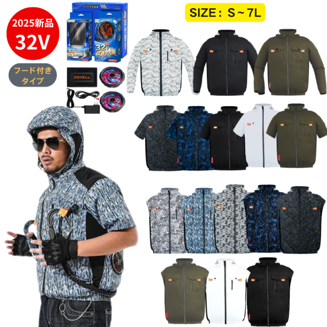 [COVELL]【2025新作・フード付き】 32V 空調服 ファン付きベスト ファン バッテリー セット フルハーネス安全帯対応 IP45耐水防塵 作業着 熱中症対策 誕生日 空気調冷服 釣り 父の日 プレゼント