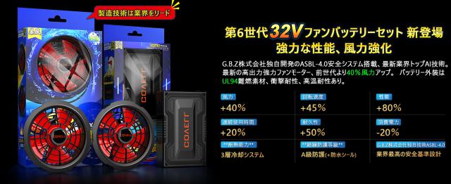 【IP45耐水 / 防塵 / 高性能ダブルボールベアリングモーター】ファンはIP45耐水防塵国際認証を取得し、1mm以上の塵埃がモーター内に侵入するのを防ぎ、寿命が延びます。ファンブレードは水道水で洗い流す事ができ、ファンの上の塵埃を簡単に清掃できます。粉塵の多い環境でも安心して使用できます。32V 超高出力のバッテリーとの組み合わせで、爽快感が上昇し、高い作業効率!さらに、モーターは高性能なダブルボールベアリング構造を採用ているので、寿命が大幅に延びます。高出力ファンは史上最強の風を生み出し、前年比で風量が40%向上しています。ファンにはICチップが組み込まれており、ブラシレスDCモーターを保護しています。ファンの内径は9cmで、すべての空調冷風服/空気調冷服に使用できます。