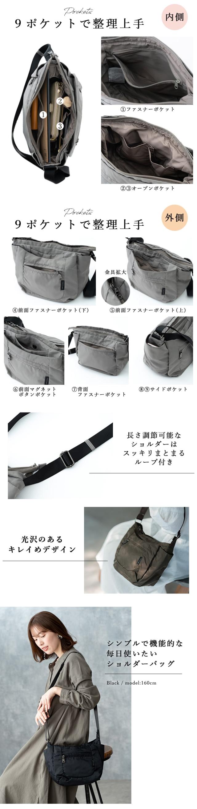 光沢のあるナイロン生地で野暮ったくならない大人のキレイめショルダーバッグ。
