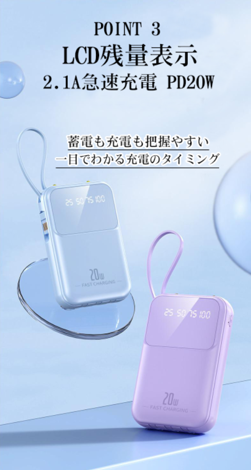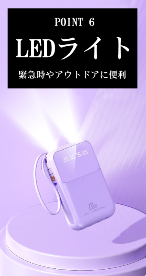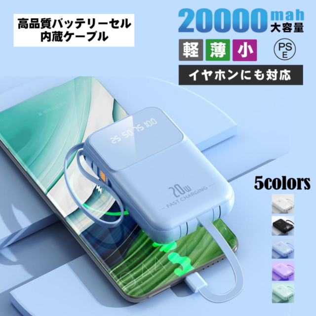(新品セール)モバイルバッテリー 20000mAh 大容量 小型 軽量 iphone 急速充電 内蔵ケーブル 高品質 PSE認証済み 照明ライト付き Micro USB Type-C lightning