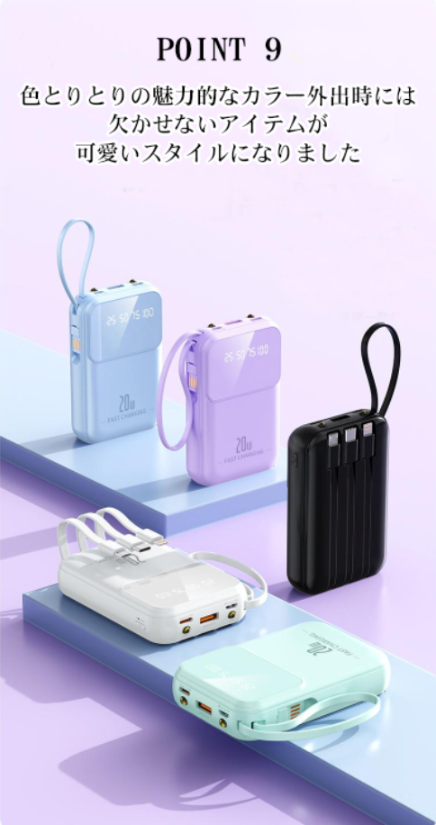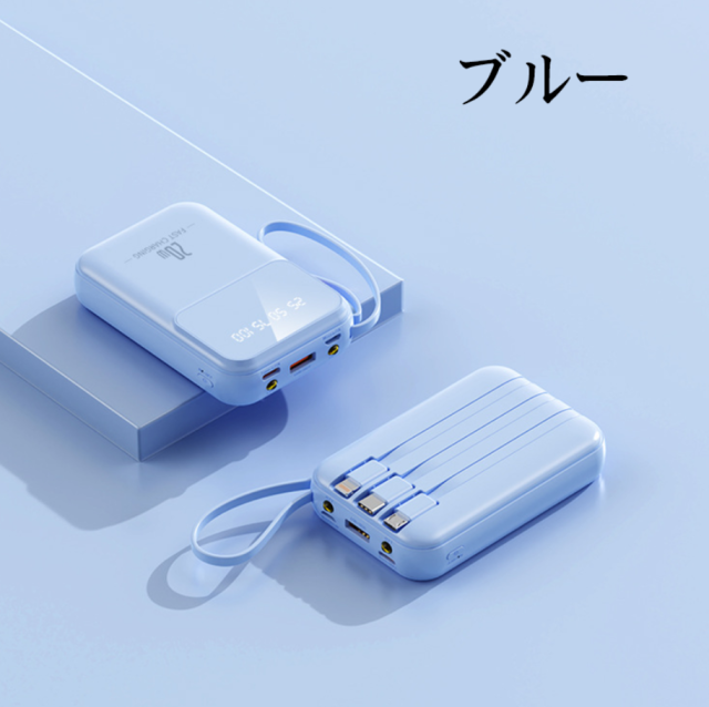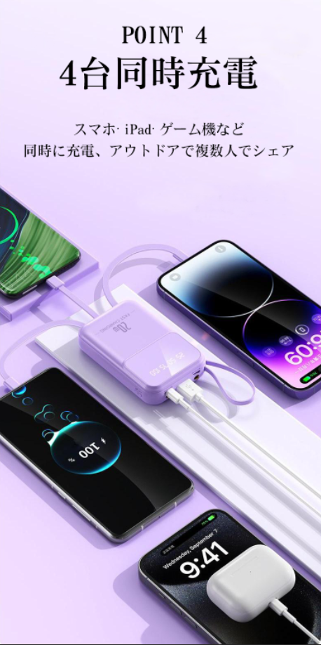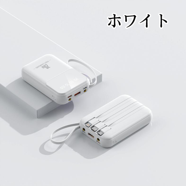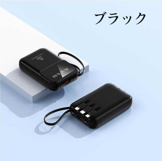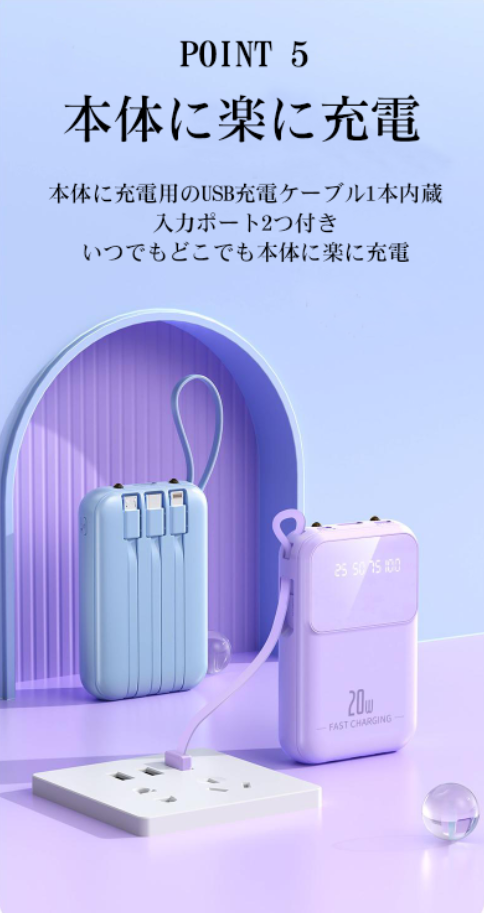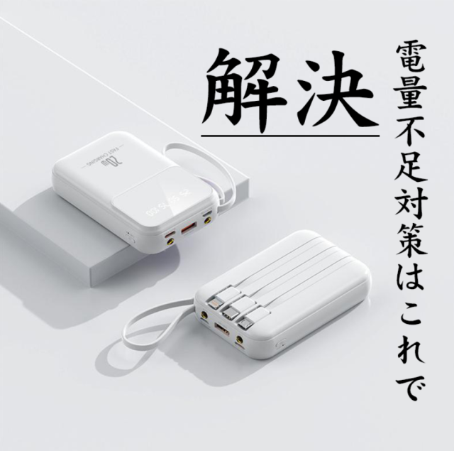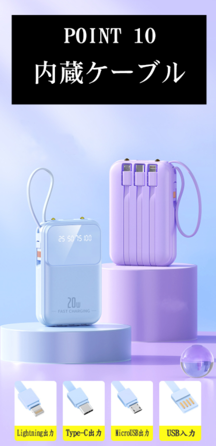 【4本ケーブル内蔵・4台同時充電可能】出力にはmicroUSB、USB とtype-Cなど3規格出力ケーブルが内蔵された 最新型のケーブル内蔵 モバイルバッテリーです。専用ケーブルを持ち歩く必要がなく、各種タイプのデバイスにも対応出来ます。ケーブルを忘れたときも充電ができないなんて心配はいりません。合わせて最大4台の機器を同時に充電することができ、パワーのある究極の携帯充電器。更に、モバイルバッテリーの本体に充電ケーブルが内蔵されているため、コンセントのある場所であれば即時充電が可能。